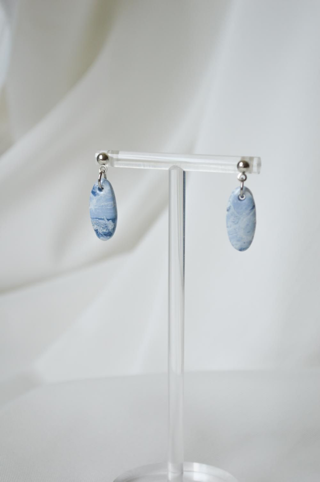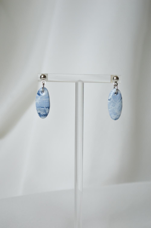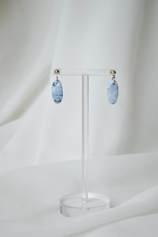 Nežna zapestnica z ročno izdelanim okroglim elementom v modro-beli marmorirani tehniki. Spominja na morje ujeta v droben kos nakita. Kovinska verižica iz nerjavečega jekla je elegantna in prilagodljiva, kar omogoča udobno nošenje. Popolna izbira za vse, ki želijo subtilen, a unikatno izdelan modni dodatek.