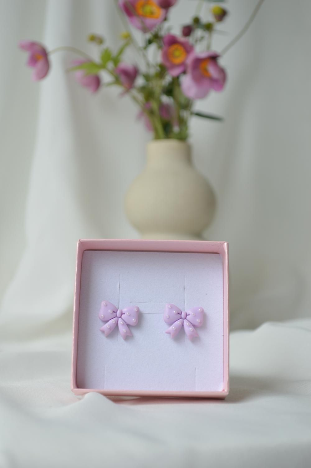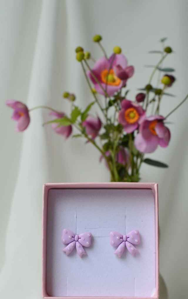 Nežni, a igrivi – ti mali uhani v obliki pentlje prinašajo popolno ravnovesje med romantično prisrčnostjo in elegantno preprostostjo. Ročno oblikovani iz polimerne gline v nežnem pastelno lila odtenku, okrašeni z drobnimi belimi perlami, ki ustvarjajo videz nežnih pikic, dodajajo kanček čarobnosti vsakemu stilu.