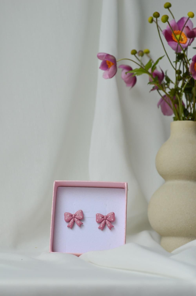 Nežni, a igrivi – ti mali uhani v obliki pentlje prinašajo popolno ravnovesje med romantično prisrčnostjo in elegantno preprostostjo. Ročno oblikovani iz polimerne gline v globokem temno roza odtenku, okrašeni z drobnimi belimi perlami, ki ustvarjajo videz nežnih pikic, dodajajo kanček čarobnosti vsakemu stilu.