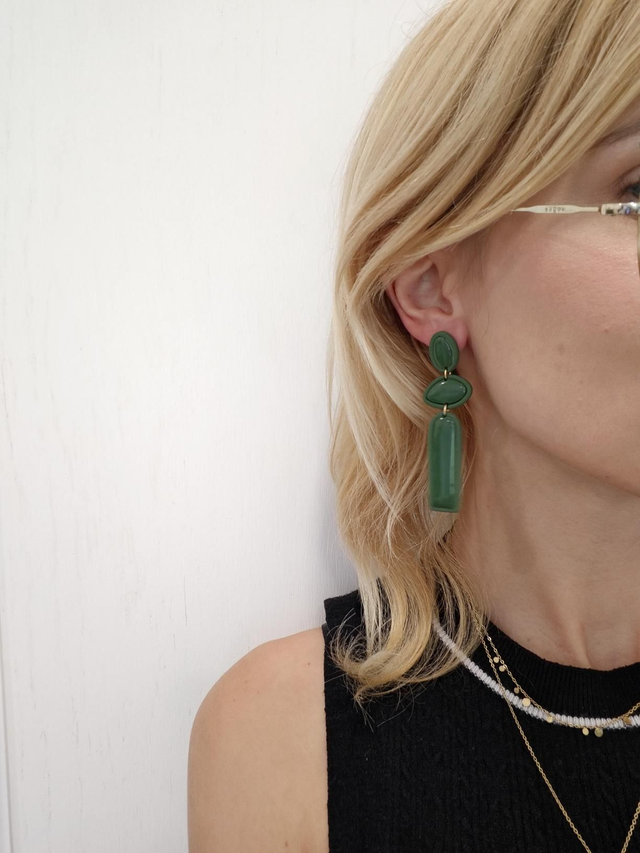 Vsak uhan je sestavljen iz dveh manjših geometrijskih oblik in podolgovate ploščice, ki skupaj ustvarjajo eleganten pretok linij. Kovinski deli so nežno pozlačeni, kar dodaja toplino in prefinjenost.