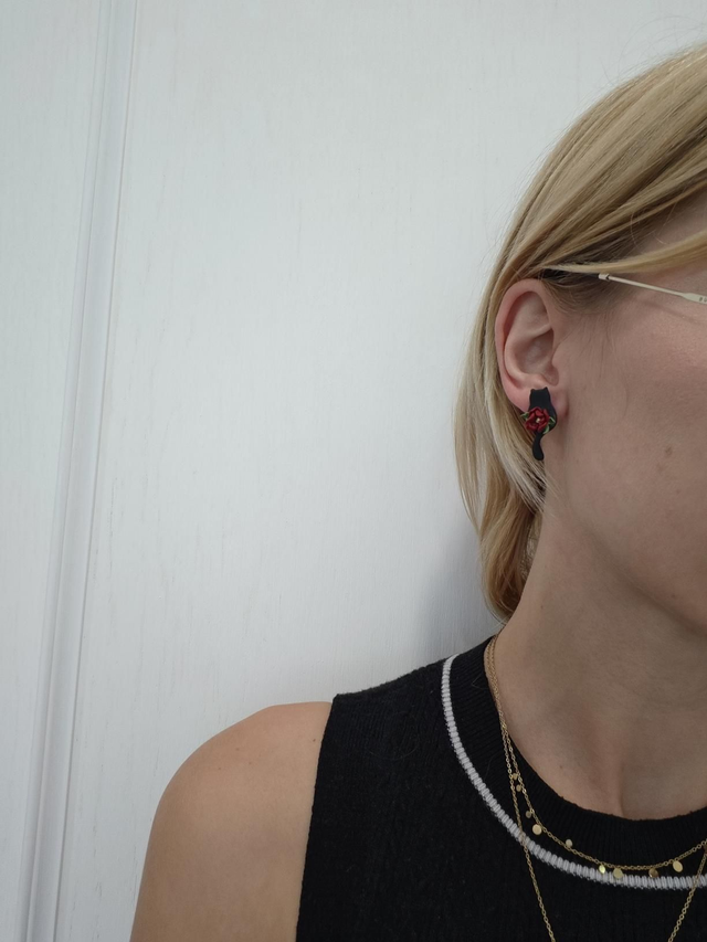 Ti uhani niso le modni dodatek, temveč prava mala umetnina, ki pritegne poglede. Črna mačka prinaša pridih mističnosti, rdeča vrtnica pa romantično toplino – skupaj ustvarjata harmoničen kontrast, ki ga je preprosto nemogoče spregledati.
