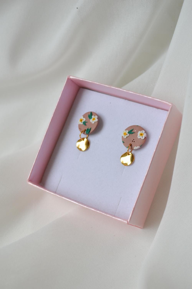 Toplina rjave barve in nežna eleganca cvetličnega motiva se v teh ročno izdelanih uhanih združita z luksuznim sijajem pozlačenega krogca. Na topli rjavi osnovi so skrbno oblikovane drobne bele cvetlice z listi, medtem ko majhna perla dodaja prefinjenost, pozlačen krogec pa vse skupaj zaokroži z elegantnim leskom.