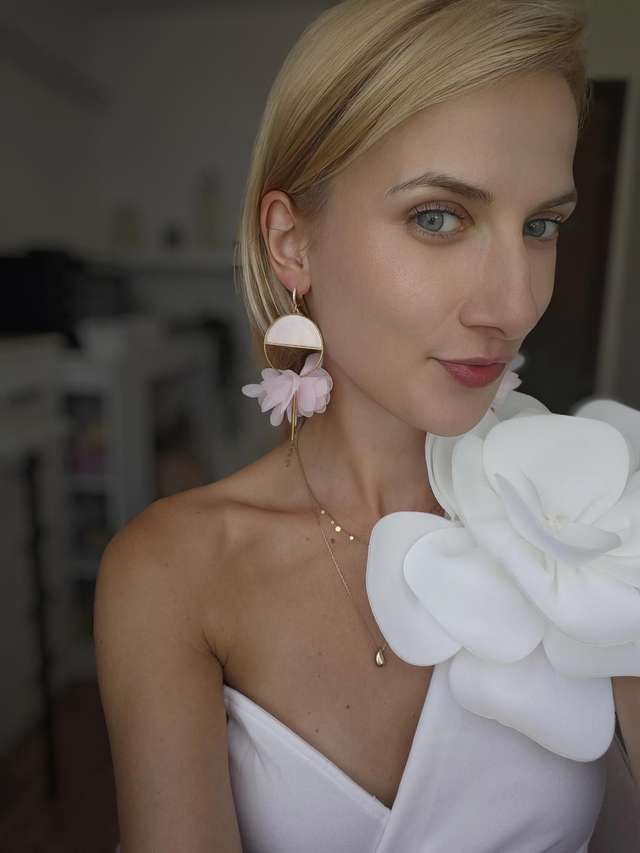 Nežnost, ujetena v gibanje. Roza različica uhanov Ples cvetov prinaša pridih čistosti, lahkotnosti in brezčasne elegance. Polkrožna osnova iz roza polimerne gline je ročno oblikovana in obrobljena z zlatimi detajli, ki ji dodajo topel, prefinjen sijaj. Spodaj se nežno zibljejo cvetni listi iz finega tekstila – kot bi nosili cvet v vetru.